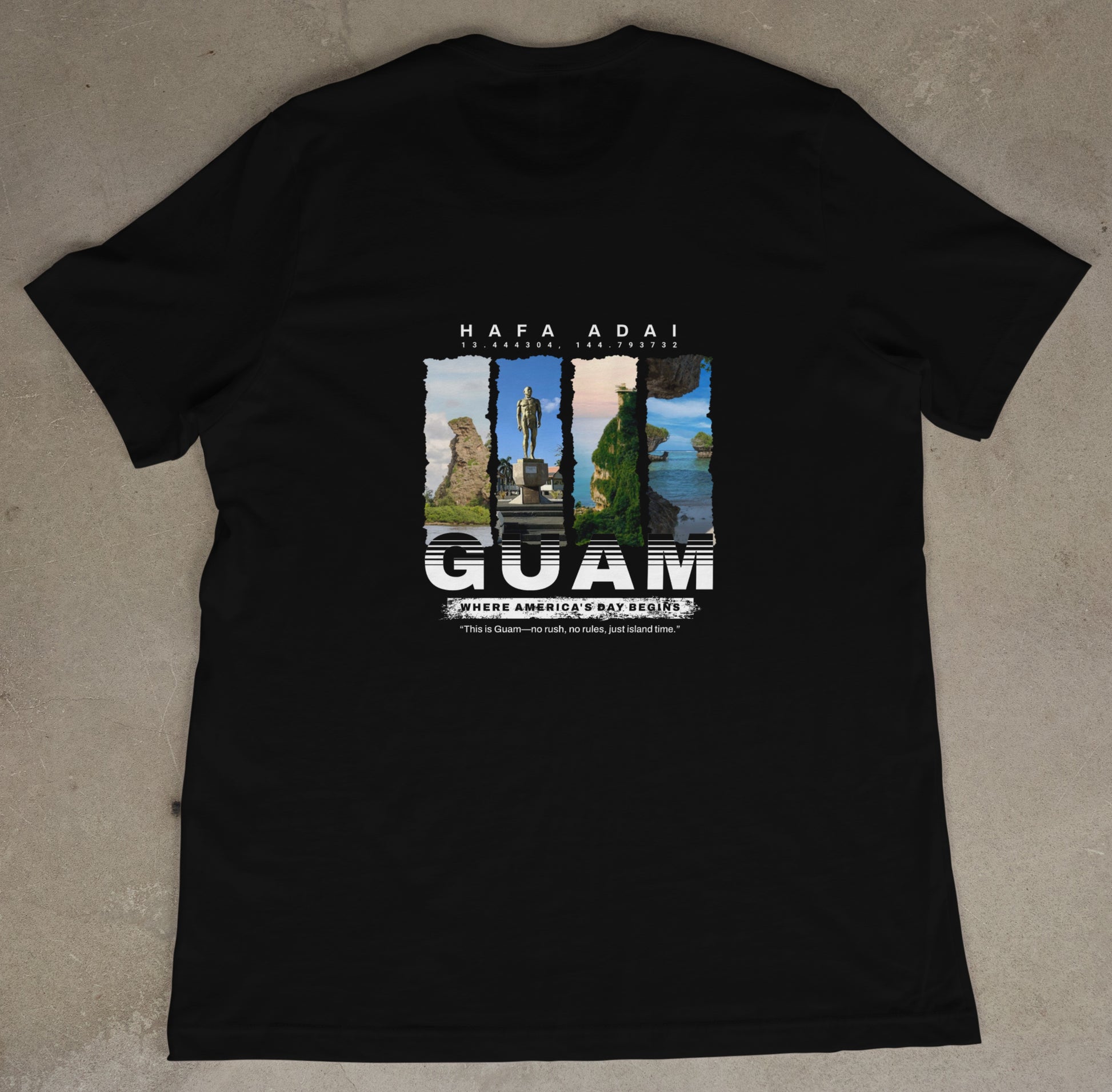 This design captures the soul of Guam—bold, timeless, and unapologetically proud. Featuring iconic island landmarks torn through a modern layout, GPS coordinates of paradise, and the welcoming phrase “Hafa Adai.”
